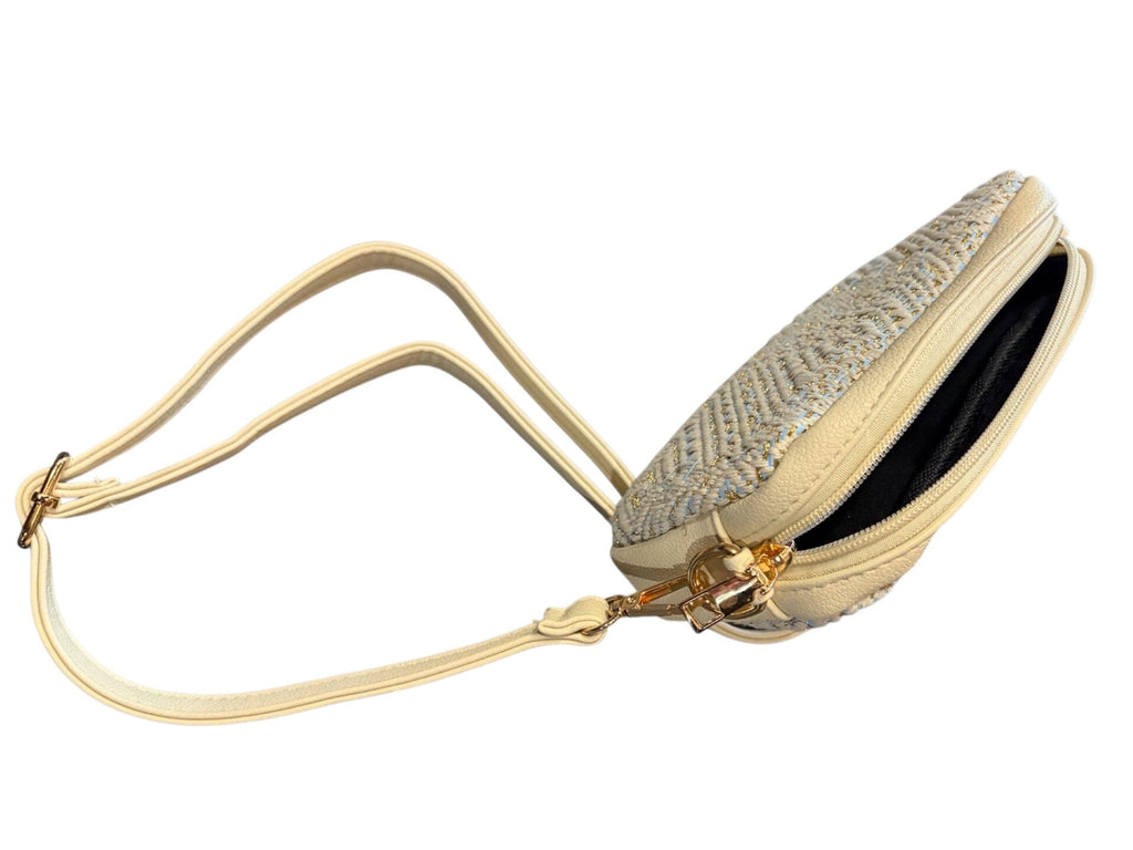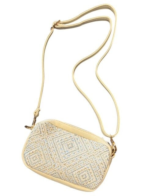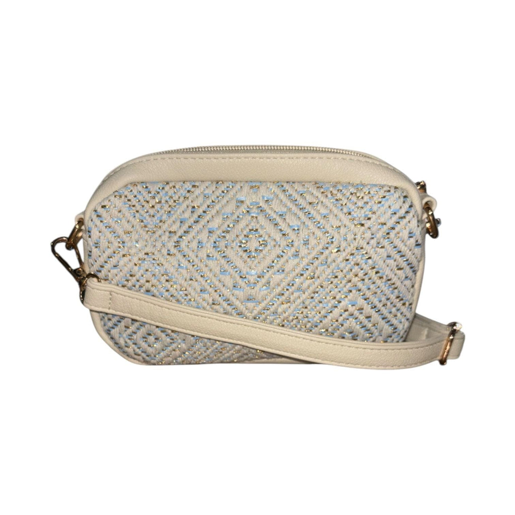Effortlessly chic and perfectly neutral, this woven geometric crossbody is the everyday bag your wardrobe has been waiting for. Designed in a soft cream and light blue pattern with luxe gold-tone hardware, it blends timeless style with modern ease.