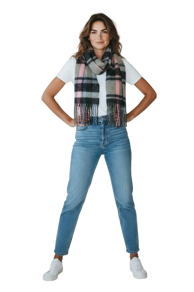 Wrap yourself in cozy charm with this soft plaid scarf that blends grey and pink hues into one delightful design. The playful color mix brings instant personality to any outfit, while the fringe detailing adds a fun, textured finish. Perfect for layering over sweaters, dresses, or jackets, this versatile accessory keeps you warm and stylish through every season. Whether you're heading out for a casual day or dressing up your everyday look, this scarf is your go-to companion for effortless flair.