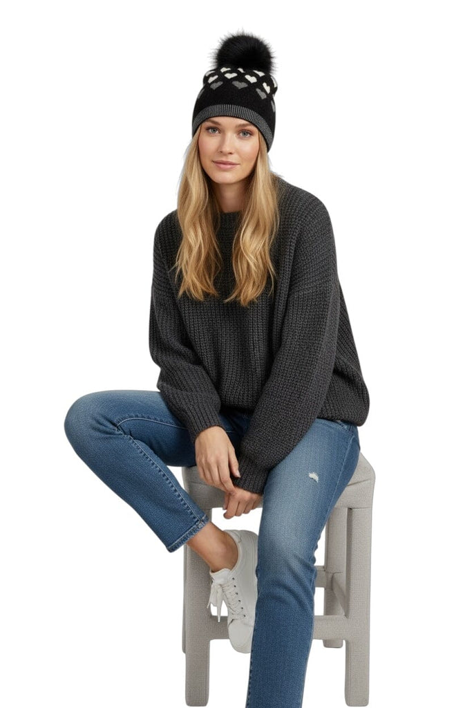 Elevate your winter wardrobe with this charming pom pom toque, featuring a striking White/Black heart design. Crafted for both style and warmth, this knit beanie combines playful aesthetics with practical functionality. The signature pom pom adds a touch of personality, while the soft construction ensures comfort during cold Canadian winters. Perfect for those who appreciate fashion-forward accessories that don't compromise on coziness.