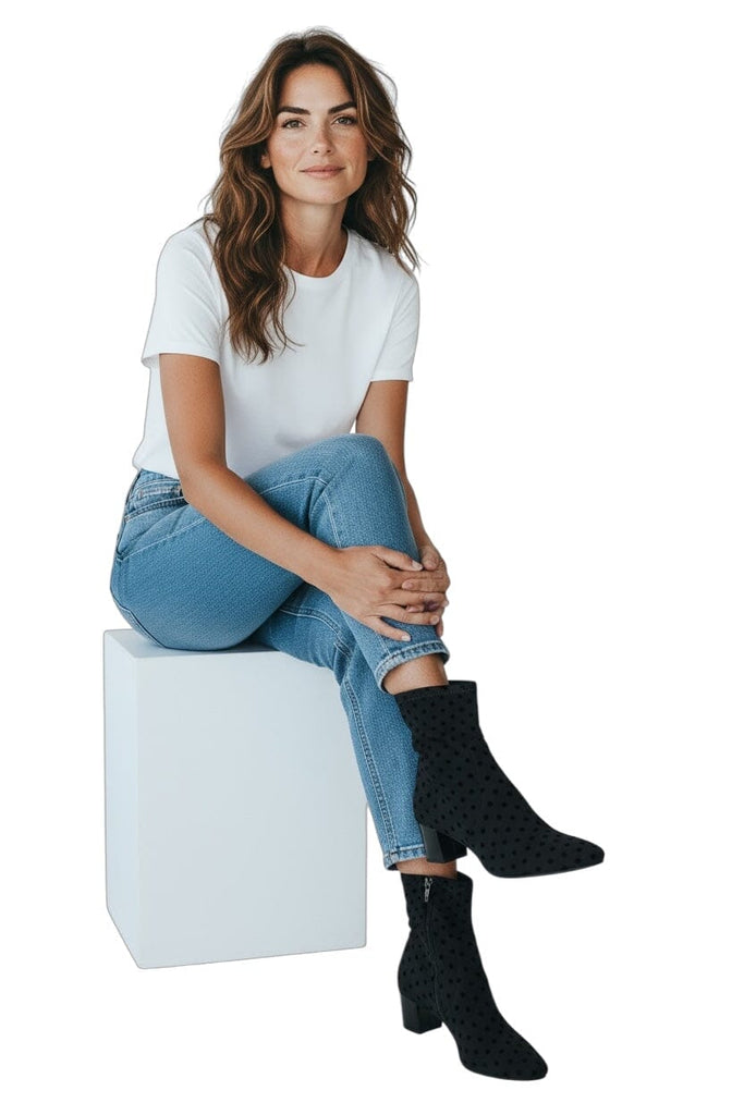 Make a bold statement with this striking black high ankle boot, engineered for both style and stability. The chunky heel provides confident support and a grounded silhouette, while the distinctive polka dot texture adds visual interest and dimension to the classic black base. Perfect for elevating everyday looks or creating edge-forward ensembles, this boot combines contemporary design with practical wearability. The high ankle cut offers secure coverage and a flattering leg line, making it a versatile addition to any fashion-forward wardrobe.