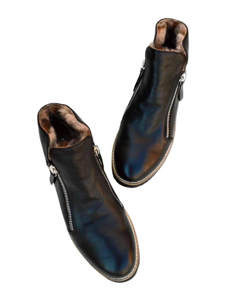 Step into sophistication with this striking black leather ankle boot, engineered for both style and practicality. Dual side zippers ensure effortless on-and-off convenience, while the luxurious faux fur leopard lining adds an unexpected touch of glamour and warmth. The sleek black leather exterior pairs seamlessly with any wardrobe, making these boots a versatile essential for transitional seasons. Perfect for elevating casual outfits or complementing polished ensembles, this boot delivers refined elegance with a hint of wild-card flair.