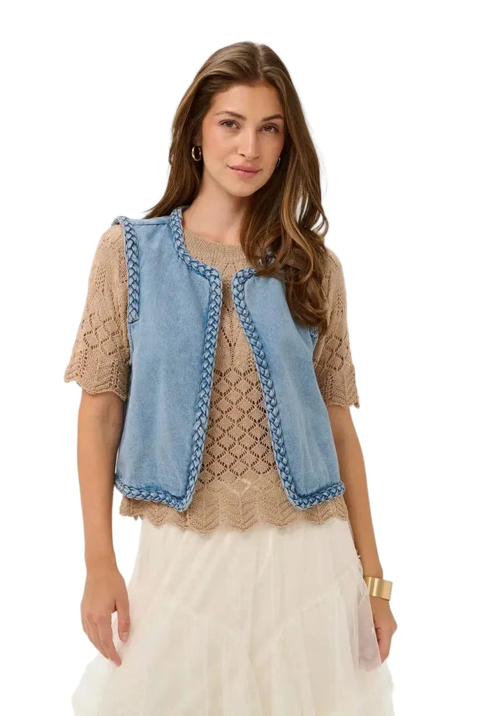 OPEN FRONT BRAIDED DENIM VEST Vest CREAM 34 Blue Denim