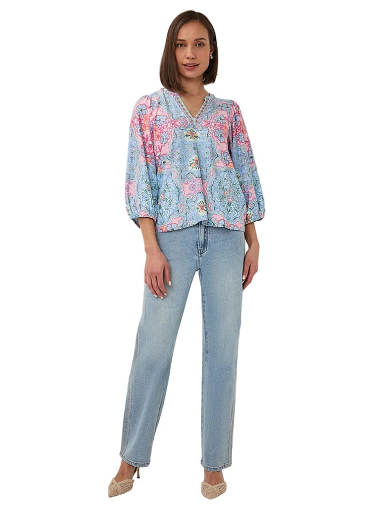 Embrace effortless elegance with this charming v-neck top, where soft pastel hues meet intricate paisley detailing. The delicate embellishments add a touch of whimsy and sophistication, making it perfect for elevating your everyday look or dressing up for a night out. Versatile, comfortable, and undeniably stylish—this piece is ready to become your new favorite go-to.