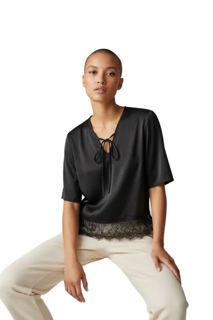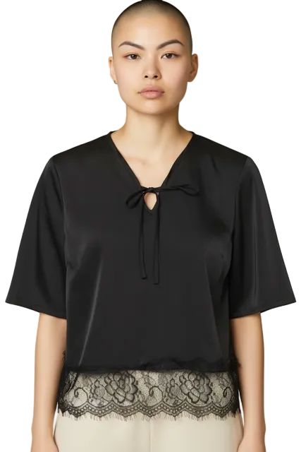 The Black Lace and Satin Top expertly marries the smooth sheen of satin with intricate lace accents to create a sophisticated and elegant piece. Designed for a refined silhouette, this top offers a luxurious feel and visual contrast that enhances any outfit, making it ideal for formal occasions or stylish evening wear. Its premium fabrics ensure comfort while maintaining an upscale, polished look.