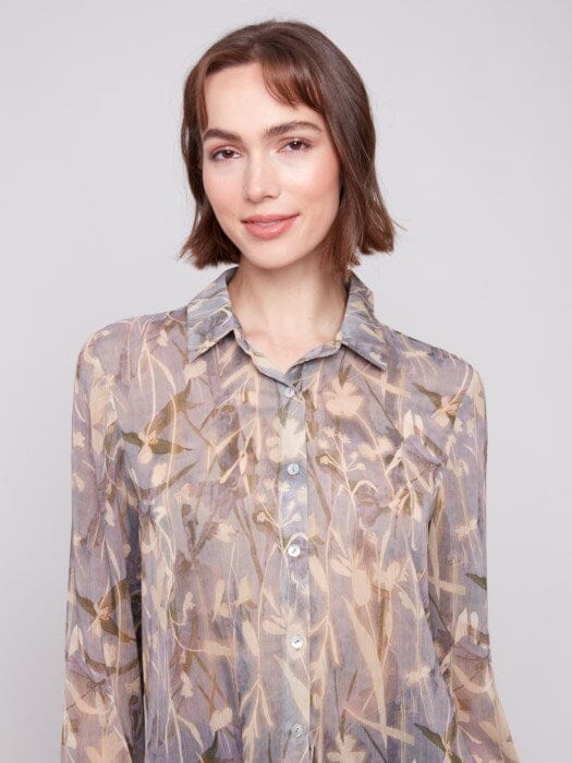 PRINTED BEIGE MIX CHIFFON BUTTON DOWN SHIRT