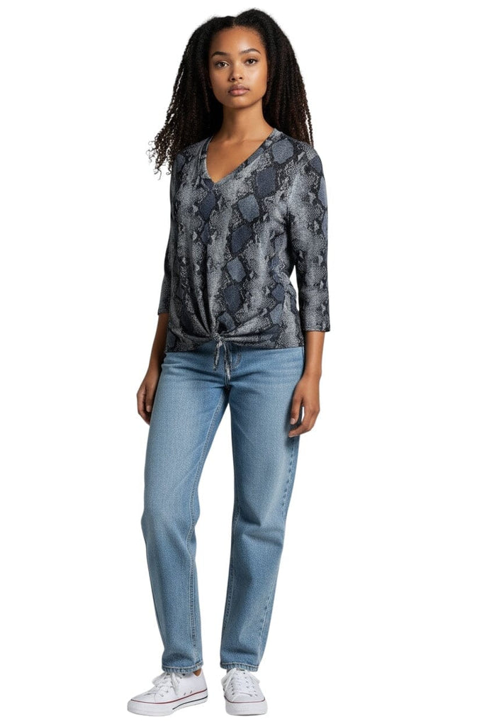 TIE FRONT NAVY CHARCOAL SNAKE PRINT VNECK TOP