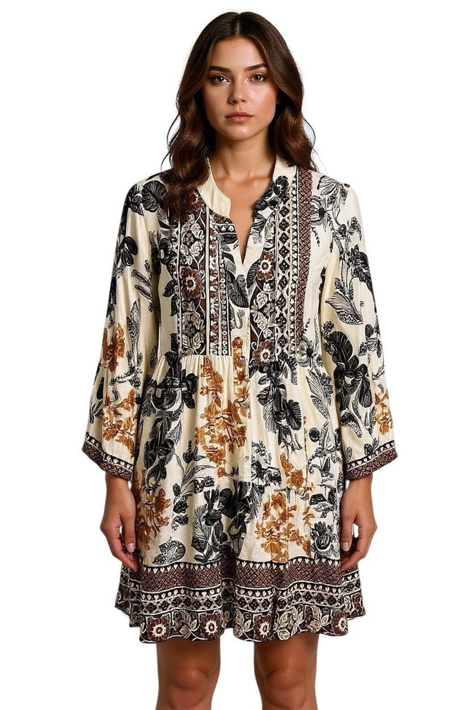 Embrace your free-spirited side with this charming bohemian short dress! Featuring relaxed 3/4 sleeves and a breezy silhouette, it's perfect for casual outings, weekend adventures, or laid-back gatherings. The effortless boho aesthetic brings an artistic, carefree vibe to any wardrobe. Pair it with sandals and accessories for an instantly cool, wanderlust-worthy look that celebrates individuality and style.