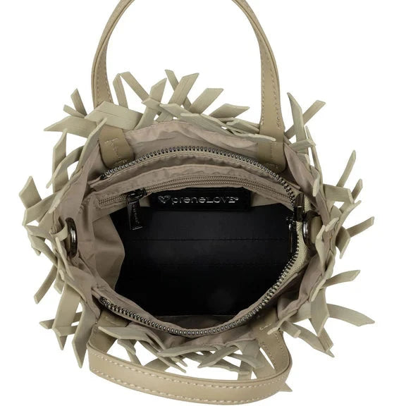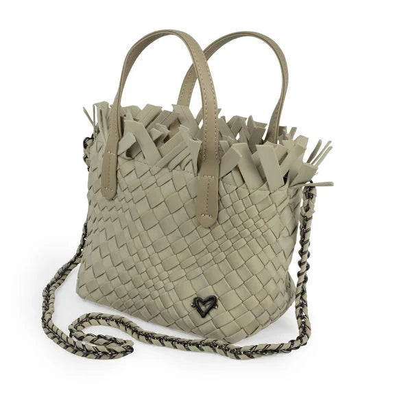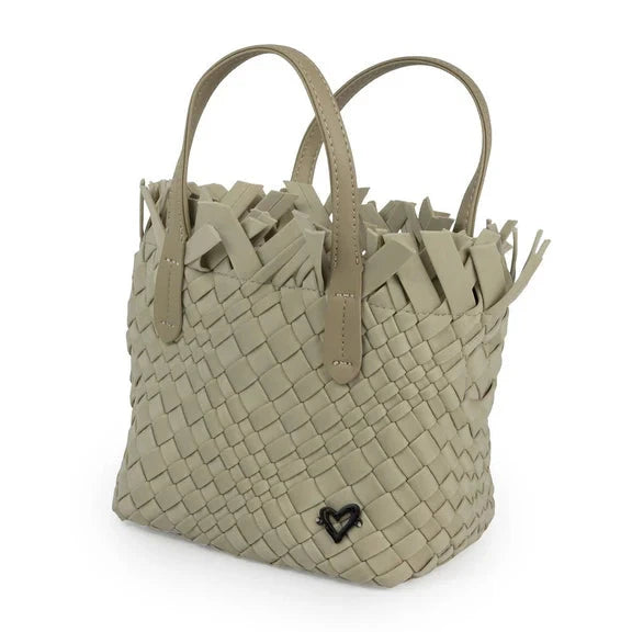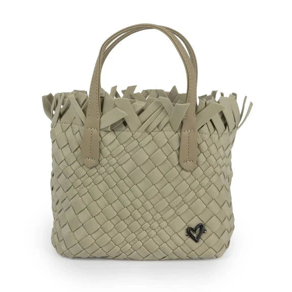 KHAKI MINI WOVEN FRINGE TOP TOTE