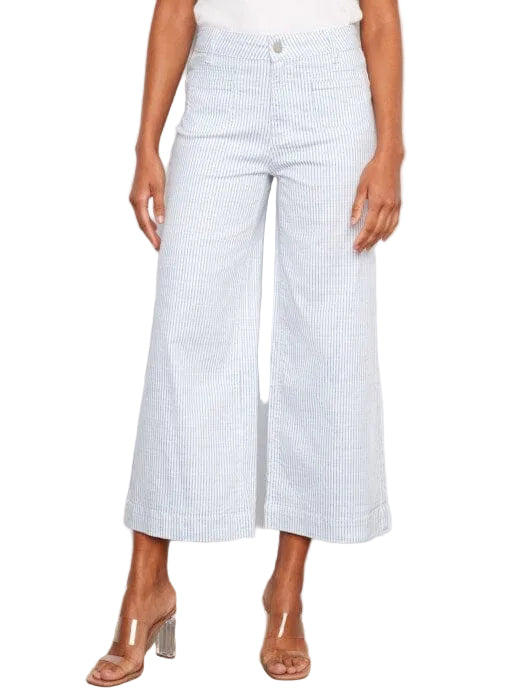 Elevate your wardrobe with these striking blue and white STRIPED TWILL CROPPED PATCH POCKET FLARE PANTS. The classic horizontal stripes create visual interest while the relaxed wide-leg silhouette offers exceptional comfort and modern sophistication. Perfect for layering or wearing solo, these versatile trousers transition seamlessly from casual outings to polished professional settings. The structured fabric maintains its shape throughout the day, ensuring you look put-together from morning to evening. A timeless piece that combines contemporary style with enduring appeal.
