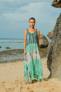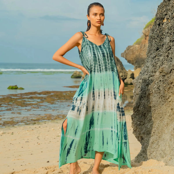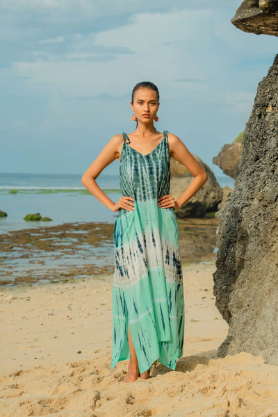 Elevate your wardrobe with our tie dye stripe long dress. With its simple yet stylish design, this dress is perfect for any occasion. Its comfortable fabric will make you feel confident and fashionable throughout the day and the tie shoulders make it easy to adjust.